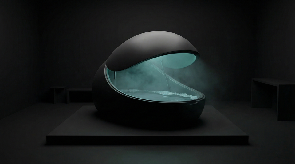 A private float suite with warm epsom-salt water, minimal sensory input, and full control over light + sound.